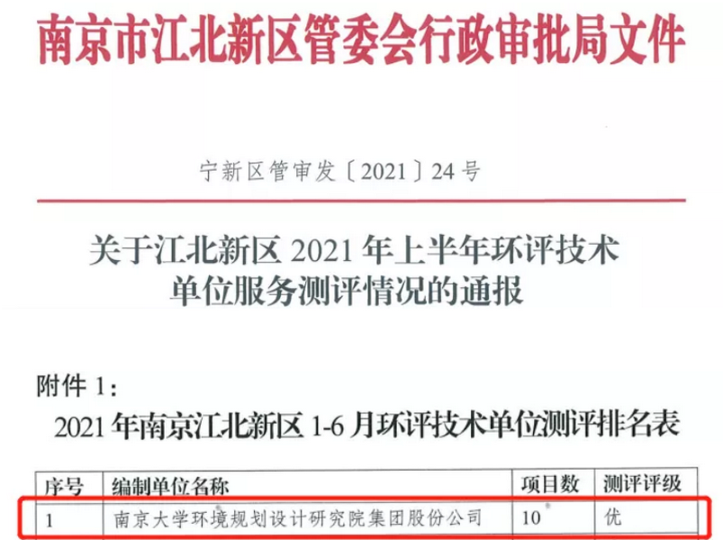 近日,南京市江北新區(qū)管理委員會行政審批局通報了2021年上半年環(huán)評單位測評情況,綜合考慮環(huán)評文件報審質量、修改時效和服務對象滿意度,南大環(huán)規(guī)院在29家參評的環(huán)評單位中評級獲優(yōu),并名列第一。