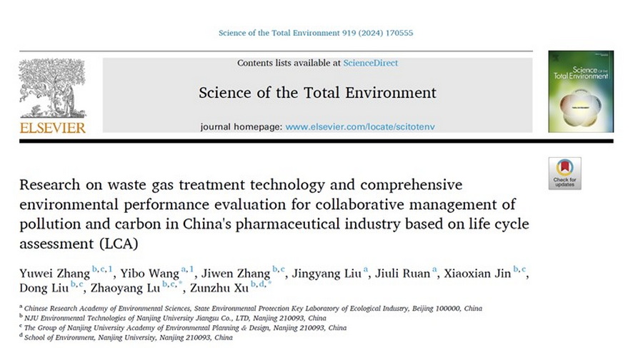 近年來(lái),南大環(huán)規(guī)院工程技術(shù)中心與中國(guó)環(huán)科院國(guó)家環(huán)境保護(hù)生態(tài)工業(yè)重點(diǎn)實(shí)驗(yàn)室聯(lián)合開(kāi)展了 VOCs減污降碳協(xié)同治理領(lǐng)域的研究。近日,相關(guān)科研成果以"Research on waste gas treatment technology and comprehensive environmental performance evaluation for collaborative management of pollution and carbon in China's pharmaceutical industry based on life cycle assessment (LCA) "為題,在《Science of The Total Environment》(中科院1區(qū)TOP,IF:9.8)上發(fā)表。