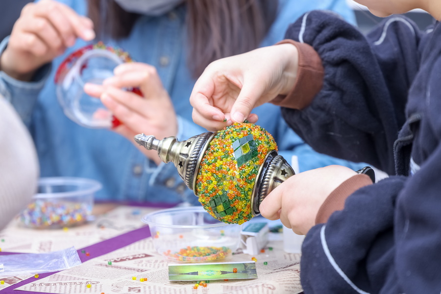 DIY環(huán)節(jié)將現(xiàn)場(chǎng)氛圍推向高潮。琳瑯滿目、形狀各異的材料盡在眼前,大家細(xì)心挑選圖案和顏色,親自動(dòng)手制作了獨(dú)一無(wú)二的土耳其琉璃燈。
