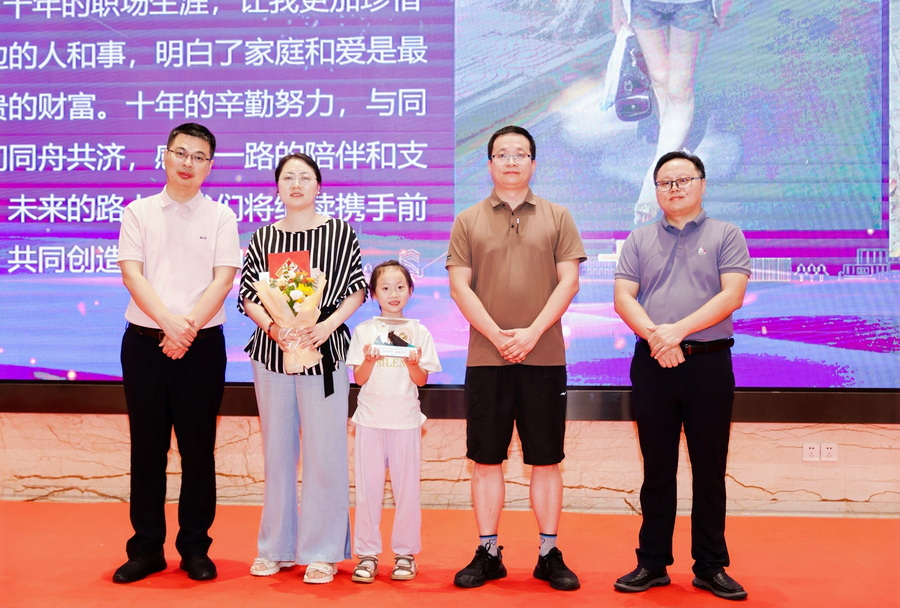 紀(jì)念儀式上,開場一段充滿趣味與感動(dòng)的紀(jì)念視頻,讓現(xiàn)場人員感受到員工在十年間的變化與成長。集團(tuán)董事長吳俊鋒和總裁張以飛為10年員工及家屬頒發(fā)了特別定制的紀(jì)念品和鮮花,代表集團(tuán)感謝各位過去十年的辛勤付出。10年員工代表李俊和章亮通過一段幽默的脫口秀,深情表達(dá)了對集團(tuán)、對同事、對家人的感謝。